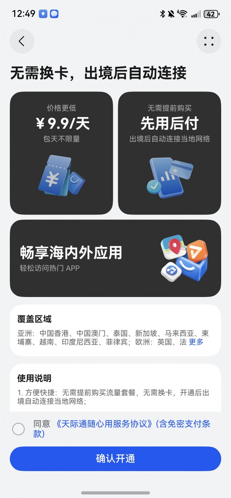 紧接着,天际通第二重礼·随心用——9.9元/天多地流量随心用,针对多地旅行或深度游用户,天际通推出「9.9元/天多地流量随心用」服务,用户无需换卡,支持先用后付,按需付费。每24小时仅需9.9元,享5GB高速流量+常速不限量,覆盖欧美、东南亚等50个热门地区;单次开通长期有效,不用不扣费,联程转机无缝衔接。