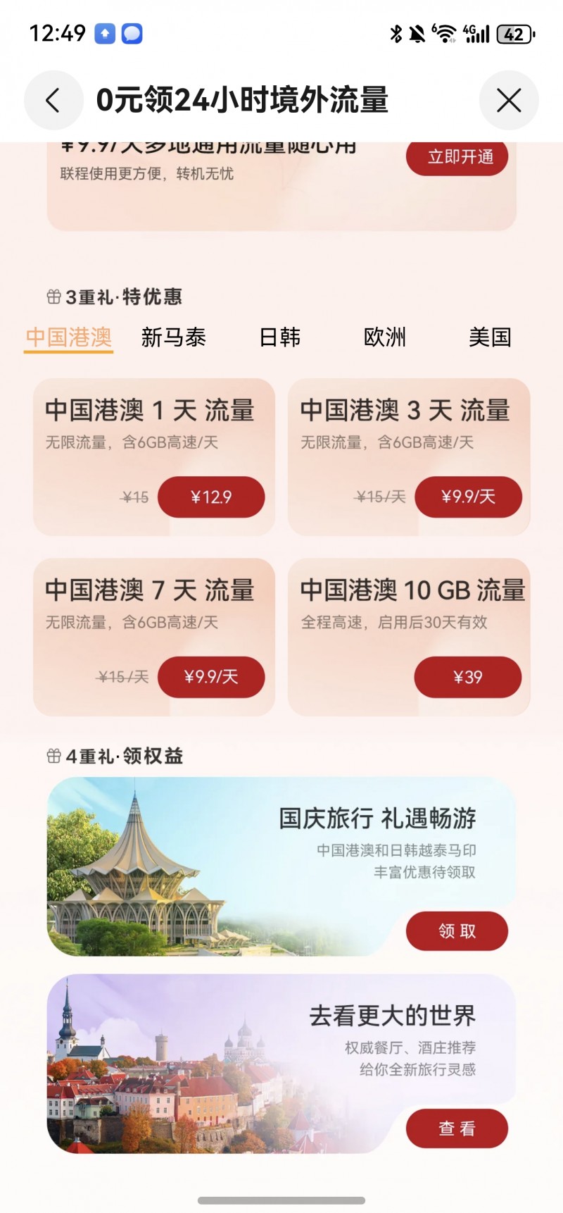 此外,天际通第三重礼·特优惠——大流量特惠,多人共享,国庆期间,天际通同时上线特惠流量套餐包,提供按天付费和按流量付费多种套餐,适用于中国香港&澳门、新马泰、日韩等高频目的地,即买即用;支持中国香港&澳门、新马泰、日韩、欧洲、美国等地的共享10GB大流量包,热点共享,全家出行或结伴旅游无需频繁续费,大容量流量一次囤够。