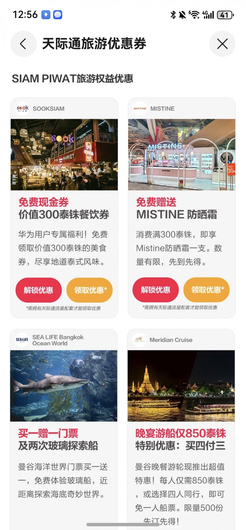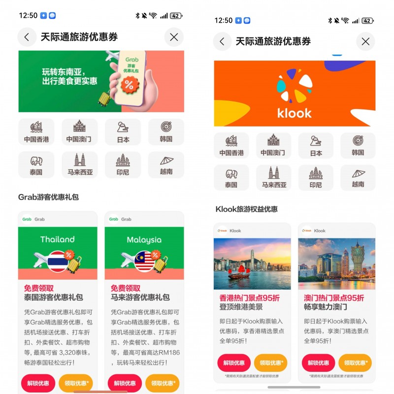 华为手机用户开启天际通流量后,可以在泰国、马来西亚、越南、印尼免费领取Grab游客优惠礼包,凭Grab优惠礼包即可享受精选服务,包括机场接送、打车折扣、外卖餐饮、超市购物等出游场景,轻松畅游东南亚。还可领取Klook旅游权益优惠,无论您是在中国香港&澳门畅游看夜景,还是在日本观赏和风之美,在韩国感受韩风潮流、越南邂逅灯火古镇,即可享受景点购票全单95折优惠。在活动页还可领取朗廷卓逸会全球酒店住宿礼遇及专属优惠房价,共覆盖全球超过30家知名酒店。